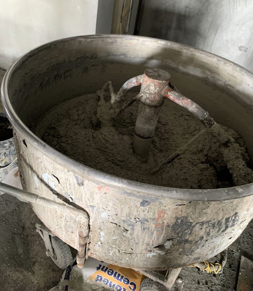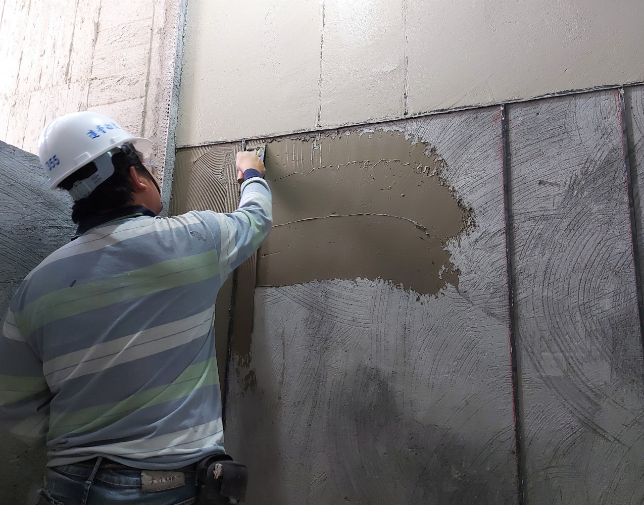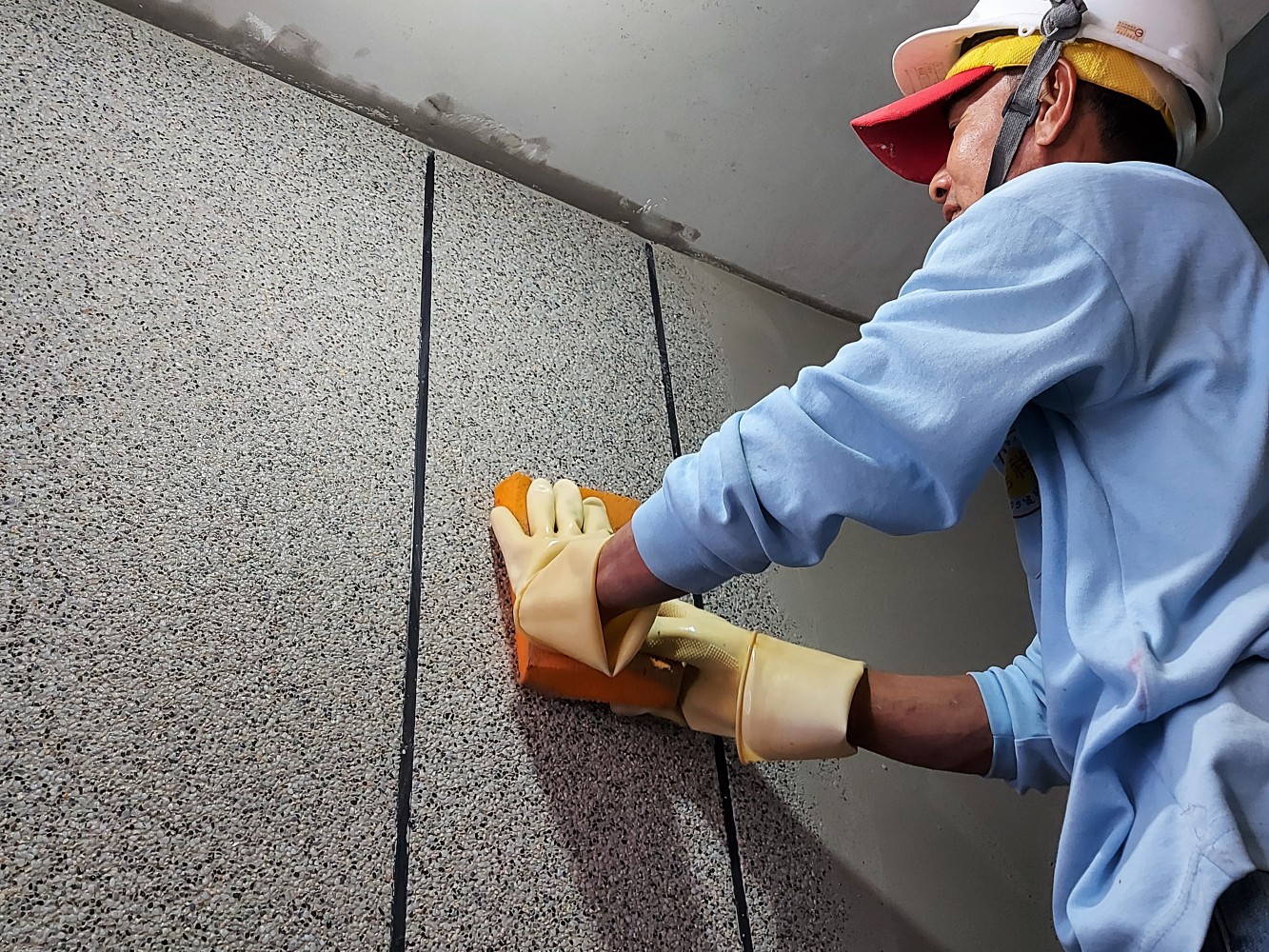 將混合的抿石子一遍遍在牆面抹開(kāi),